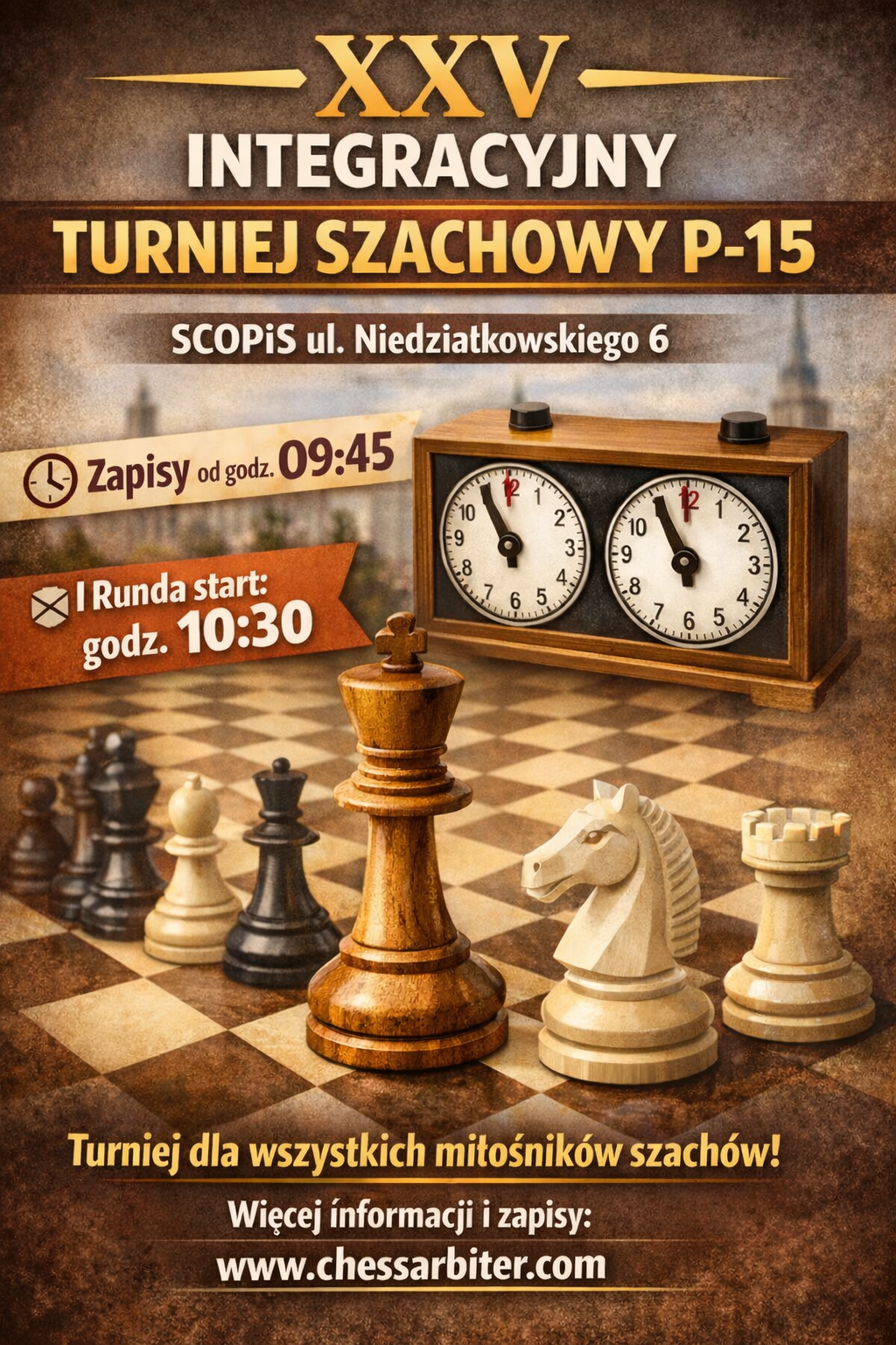 Serdecznie zapraszamy na XXV Integracyjny Turniej Szachowy P-15, który odbędzie się w SCOPiS przy ul. Niedziałkowskiego 6.